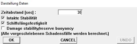 Unterschiedliche Werte für Biegemomenten und Scheerkräften können auf ein Schiff zutreffen, wenn es fährt oder im Hafen lieft. Wenn diese Werten vorhanden sind, können die passende Werte hier selektiert werden. Die selektierte Werte ist auch ein Indizierung der Ausgabe der Längsfestigkeit.