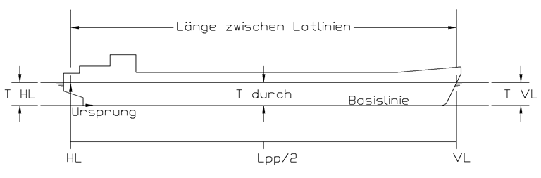 - Mittschiffslinie. Alle transversalen Abstände relatieren zu der Mittschiffslinie, Stb ist positiv und Bb ist negativ.