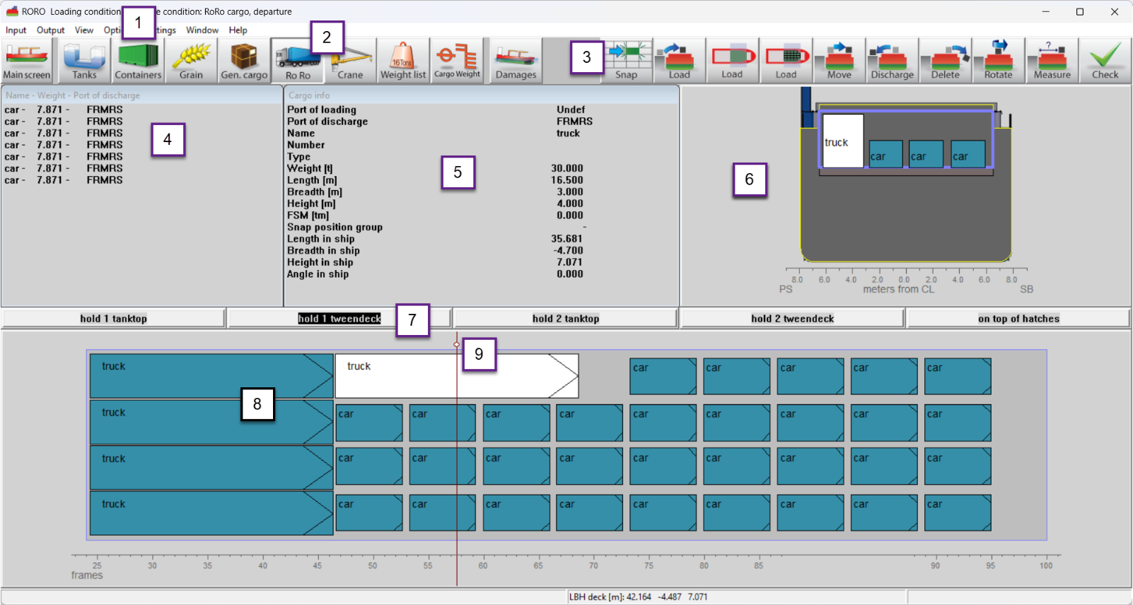 - The first piece of cargo is automatically selected, but you can also select a different cargo item in the RoRo-cargo list 4.