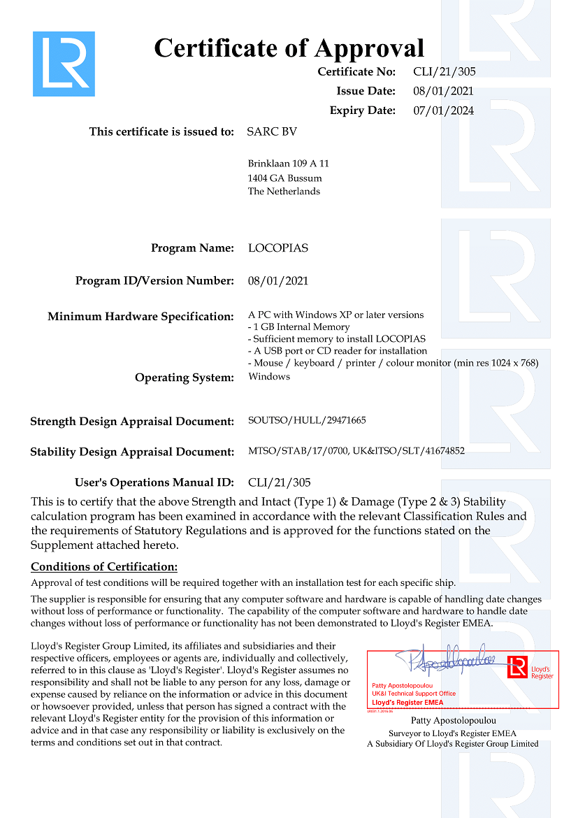 LOCOPIAS wordt geaccepteerd door alle belangrijke klassebureaus en voldoet aan Cat. B en C van ISO-norm 16155. (Shipboard Loading Instruments). Hieronder zijn enkele van de goedkeuringscertificaten van PIAS en LOCOPIAS van enkele belangrijke instellingen opgenomen. Andere instellingen mogen helemaal geen goedkeuringscertificaten afgeven, of SARC heeft niet om dergelijke certificaten verzocht. In dat geval beschikken klassebureaus over goedkeuringsprocedures voor elke scheepsspecifieke LOCOPIAS-versie. Merk op dat voor geen enkele LOCOPIAS-versie ooit goedkeuring is geweigerd door één van de klassebureaus, ongeacht of die klasse al dan niet goedkeuringscertificaten heeft afgegeven voor LOCOPIAS of PIAS.