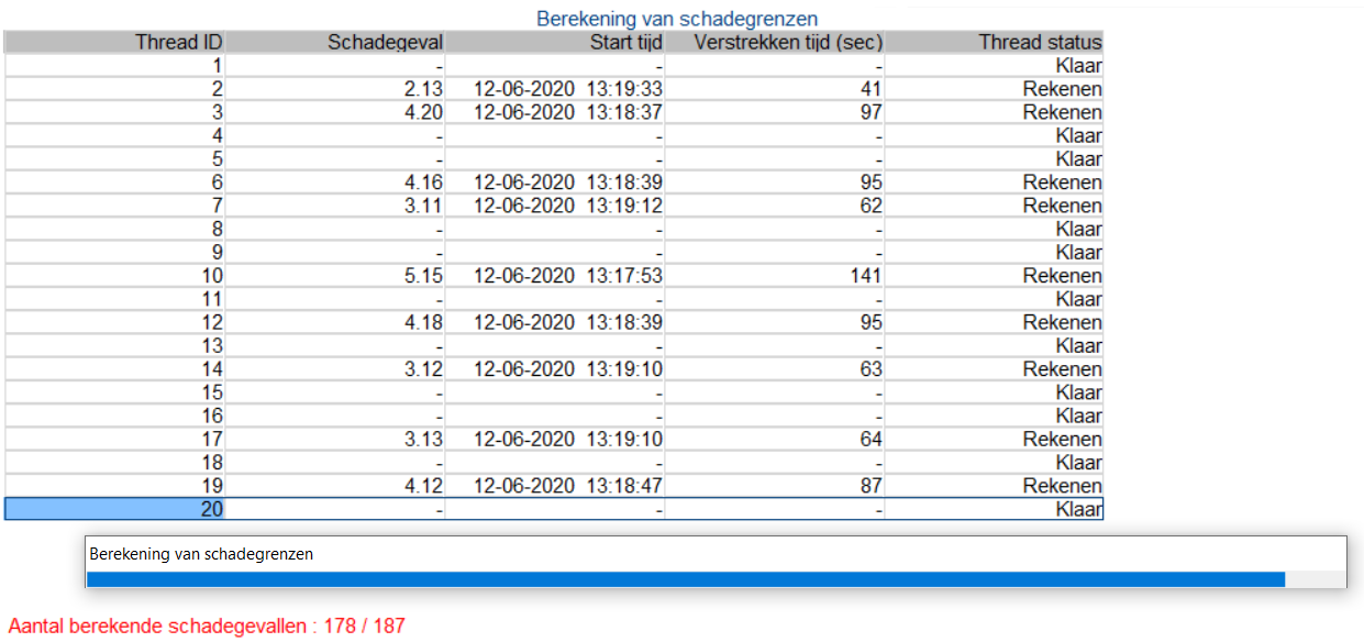 Als een thread klaar is met een rekentaak, dan krijgt deze een nieuwe rekentaak toebedeeld door de applicatie. Net zolang totdat er geen rekentaken meer zijn. De afbeelding laat een voorbeeld zien van een berekening in zijn laatste minuten, waarbij enkele threads al klaar zijn. Er zijn dus geen rekentaken meer beschikbaar, de berekening loopt ten einde.